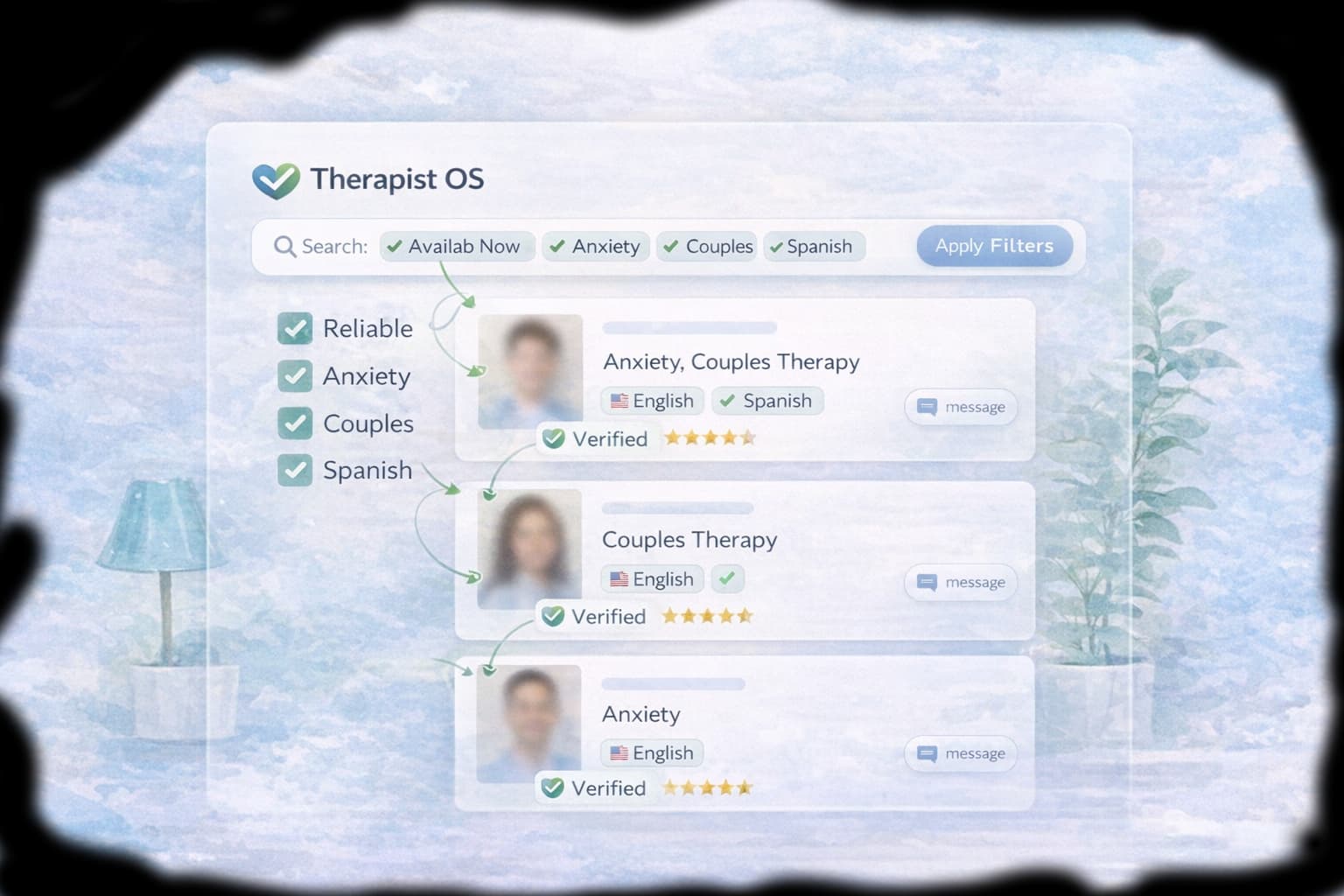 • Reliable. A smart algorithm helps match therapists with the client's needs (in development). Rich therapist profiles provide all the info for an informed choice.